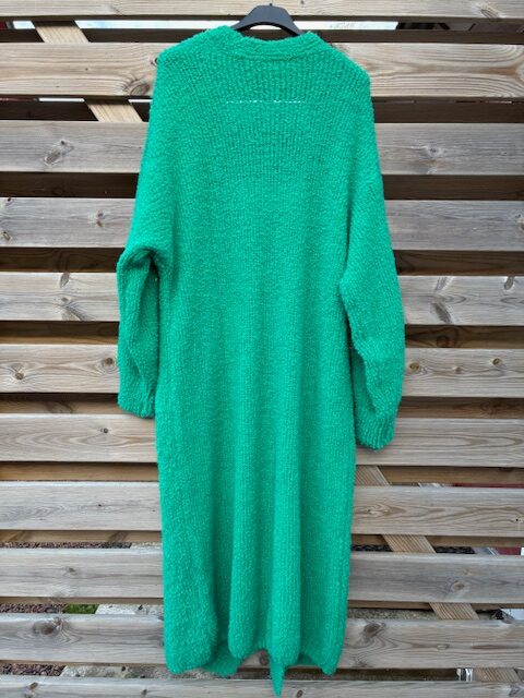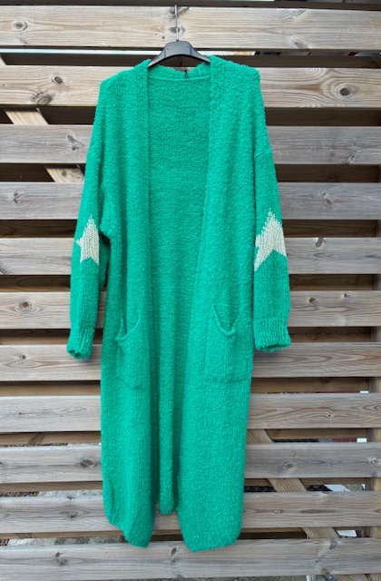 Härligt grön stickad långkofta med stjärnor vid armbågen. Fickor framtill.