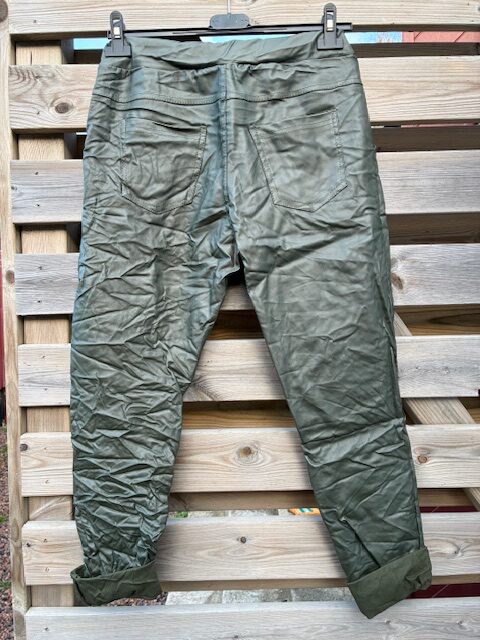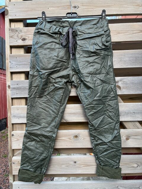 Galet skön byxa i Veganskt skinn/”fake Skin”. Resår/snörning i midjan. Vik upp eller vik ner benen för rätt längd. Fickor både fram och bak.